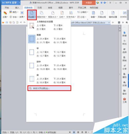 3、选择菜单栏的页面布局中的页边距,选择自定义页边距