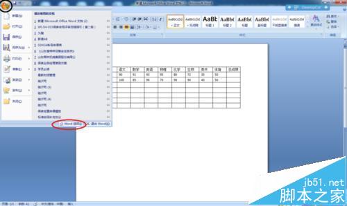 1、打开一个带有表格的Word文档,点击Office按钮中的Word选项。