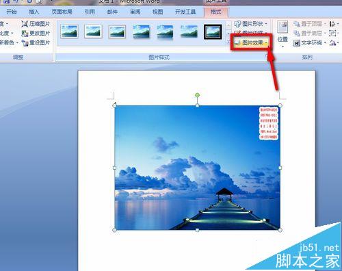 4、现在我们就看到图片已经插入到我们的页面里了,这时候我们的菜单栏下方的选项栏里有一个"图片效果"的选项,点击。如下图所示: