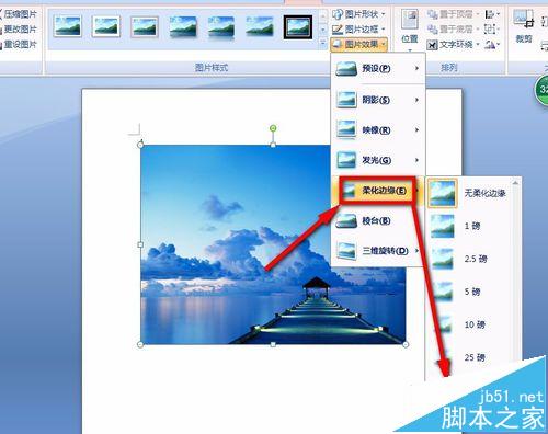 5、点击"图片效果"之后,我们找到下方的"柔化边缘"选项,在弹出来的选项里跟具情况选择需要柔化的大小数值,我以柔化50磅为例。如下图所示: