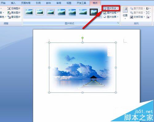 7、找到菜单栏上的"图片形状"的选项,如下图所标示的地方,点击进行。