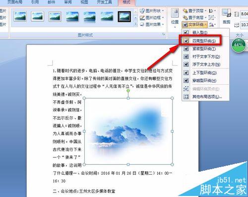 10、点击菜单栏上的"文字环绕"选项,然后在弹出来的选项框内找到我们所需要的环绕方法,如下图所示: