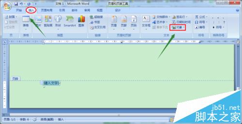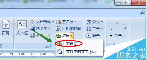 3、然后我们依旧点击工具栏的"插入",然后在快速工具栏的"文本"选项框有一项"对象"命令,我们点击它;