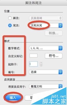 3、更改尾注的时候,注意全部的格式,因为这个每个地方要求不同,大家按照要求来更改就好了。设置完点击"插入"即可。