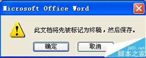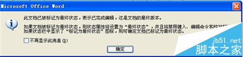 4、再次点击"确定",文档的状态属性将被设置为"最终状态",并禁止任何人的编辑、修改或保存操作,而且会在状态栏中显示"标记为最终状态"图标。