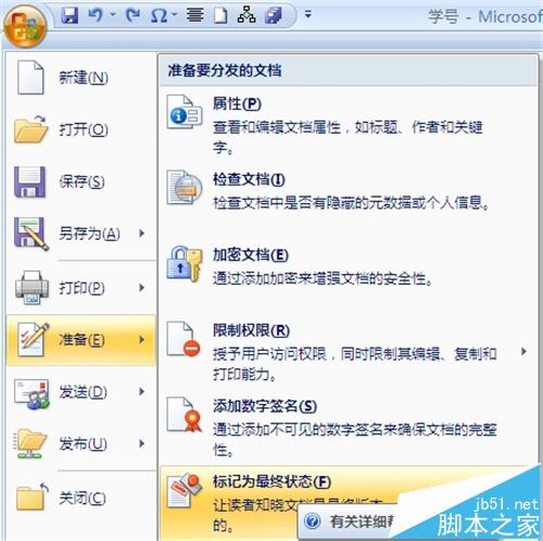 5、要取消"标记为最终状态",只需单击"Office"按钮,在弹出菜单中,点击"准备"--"标记为最终状态"
