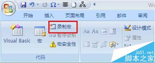 1、打开word2007文档。单击"开发工具"选项卡,在"代码"组中,单击"录制宏"。