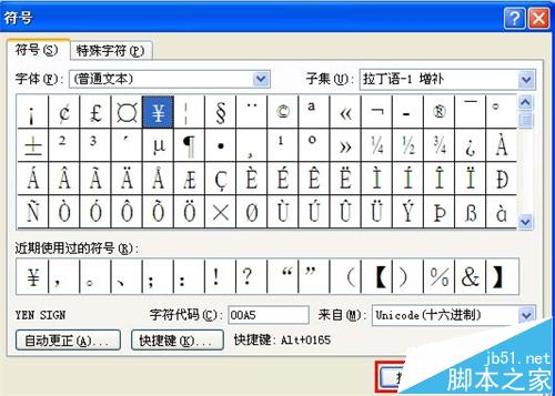 6、弹出"符号"对话框,找到"¥",单击"插入"