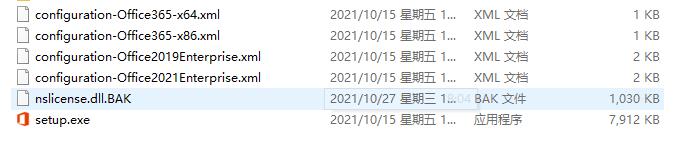 2、解压完毕,如下图。包含文件setup.exe和configuration.xml,新版包含office365和office2019/2021 64位,根据需要选择安装