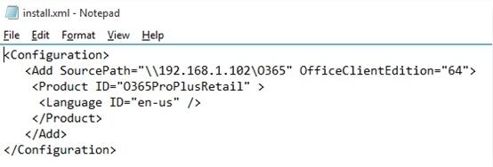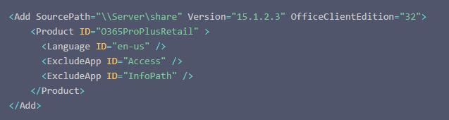 以下示例演示如何安装 32 位的 Office 365 ProPlus 英语版本(无 Access 或 InfoPath)。