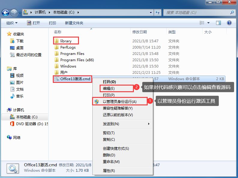 然后右键 office 2013激活.cmd 以管理员的身份运行