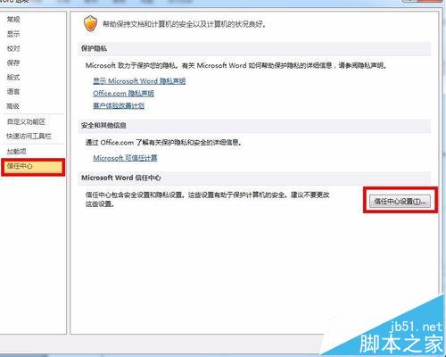 3、在"信任中心"里面有个"信任中心设置",继续点进去~