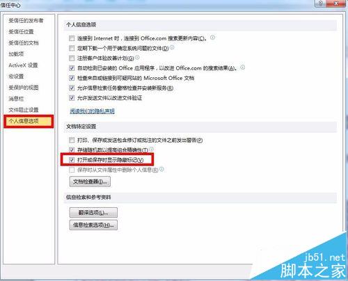 4、在"信任中心设置"里面选择"个人信息选项", 取消"打开或保存时显示隐藏标记"的选定,点击"确定"后保存文档。
