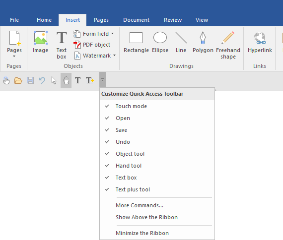 快速访问工具栏不仅为您最重要的命令提供了足够的空间,而且它还能一目了然地显示最重要的工作模式。这使您可以立即从文本编辑切换到手形工具或对象工具模式,然后再切换回来。只需单击一下,您就可以决定如何编辑您的 PDF 文档。