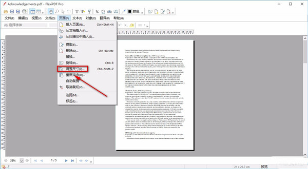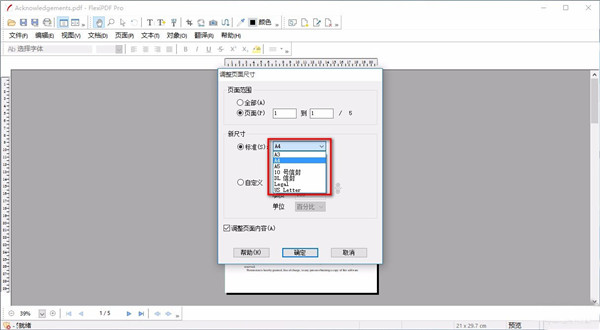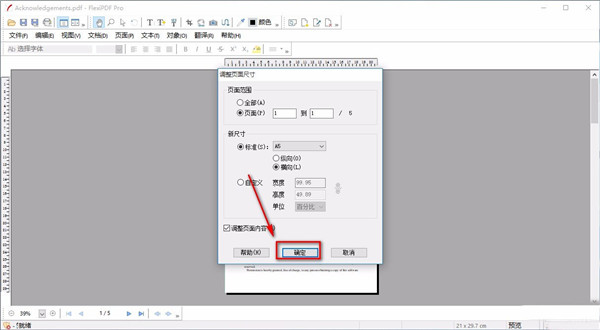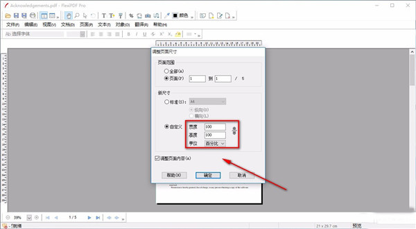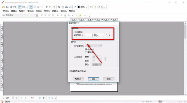 5、然后界面上就会出现一个调整页面尺寸窗口,我们在窗口左上方找到"页面范围"选项,根据自己的需要在其下方设置页面范围;如果选择"页面"选项,则还要在其后面的文本框中输入页码尺寸。