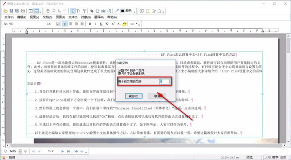 5、然后界面上就会出现一个分割文档窗口,我们在窗口中找到"每个新文件的页数"选项,该选项后面有一个文本框,在文本框中输入对应的数值,再点击"确定"按钮就可以了。