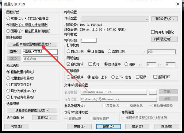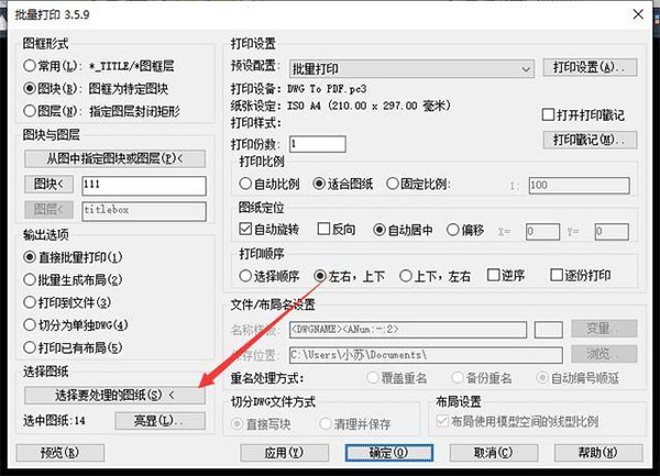 8、点击【应用】,然后【选择要处理的图纸】按键到CAD窗口去选取图纸。,把需要打印的图纸全部框选;