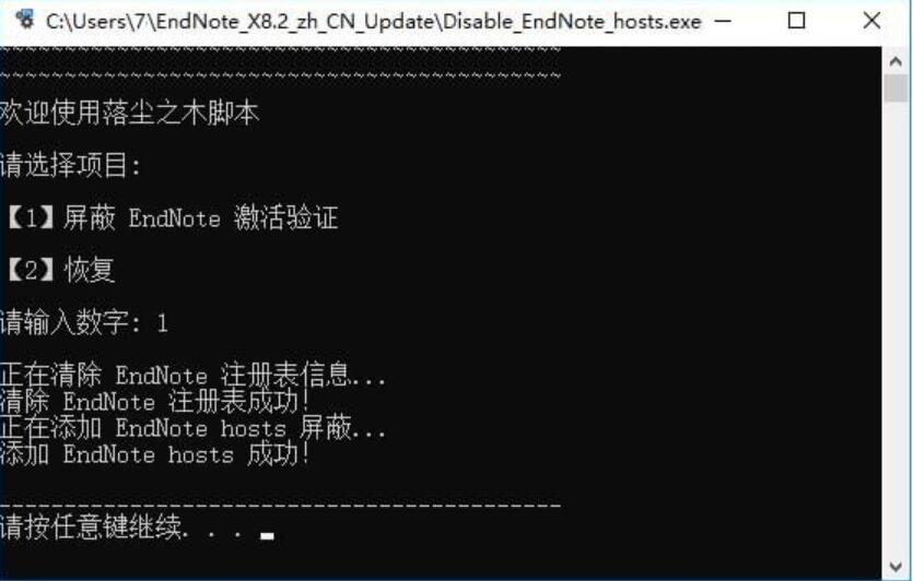 6、安装完成后运行Disable_EndNote_hosts.exe(重要),输入1屏蔽 EndNote激活验证;(这一步很重要)