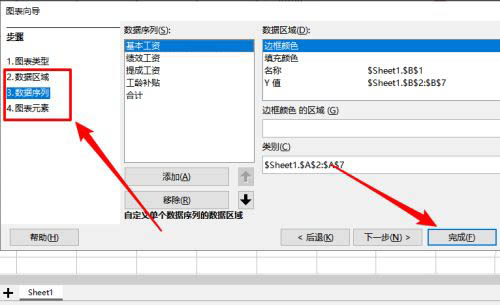 依次设置数据区域、数据序列、图表元素,点【完成】按钮。
