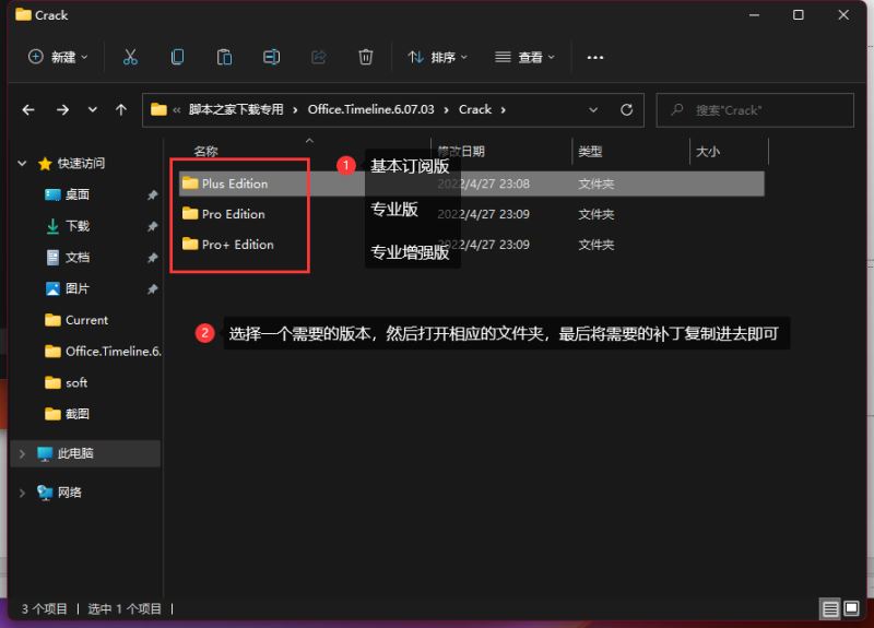 4.打开crack文件夹,大家将会看到三个文件夹,他们分别代表的是增强版(补丁安装后显示是基本订阅版)、专业版和专业增强版,大家可以更具自己的需要选择需要的版本,其实建议大家直接使用最高的Pro+专业增强版。