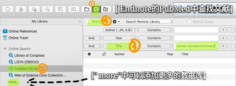 打开Endnote,点击"图标1"(Online Mode),点击2 Pubmed,在3的位置输入搜索信息。点击4(Search)查找。