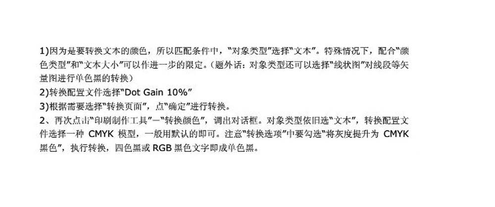 注意:"转换选项"中要勾选"将灰度提升为CMYK黑色",执行转换,四色黑或RGB黑色文字即成单色黑。