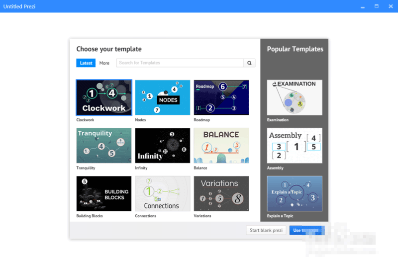 2、点击use template或start blank prezi开始创建,这是其中一个模板,如果要用中文,首先更改字体库,见以下经验篇幅有限。基本操作在以下文档中详细解释