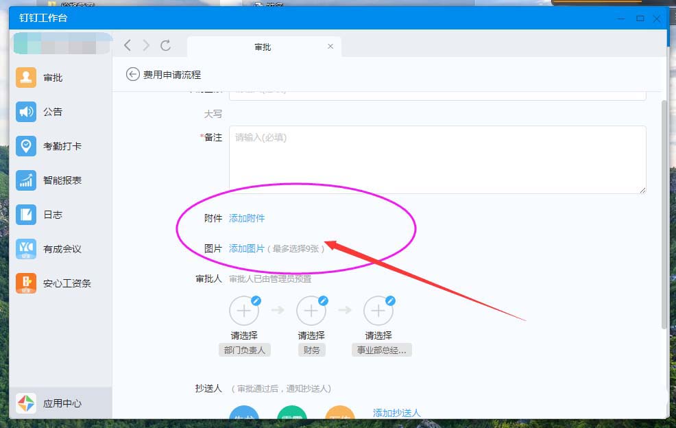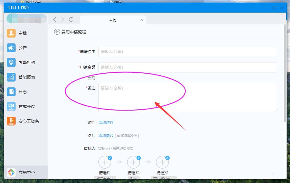 第四步:备注。"备注"即费用申请的特殊情况原由阐述说明皆可写在此处;如下图: