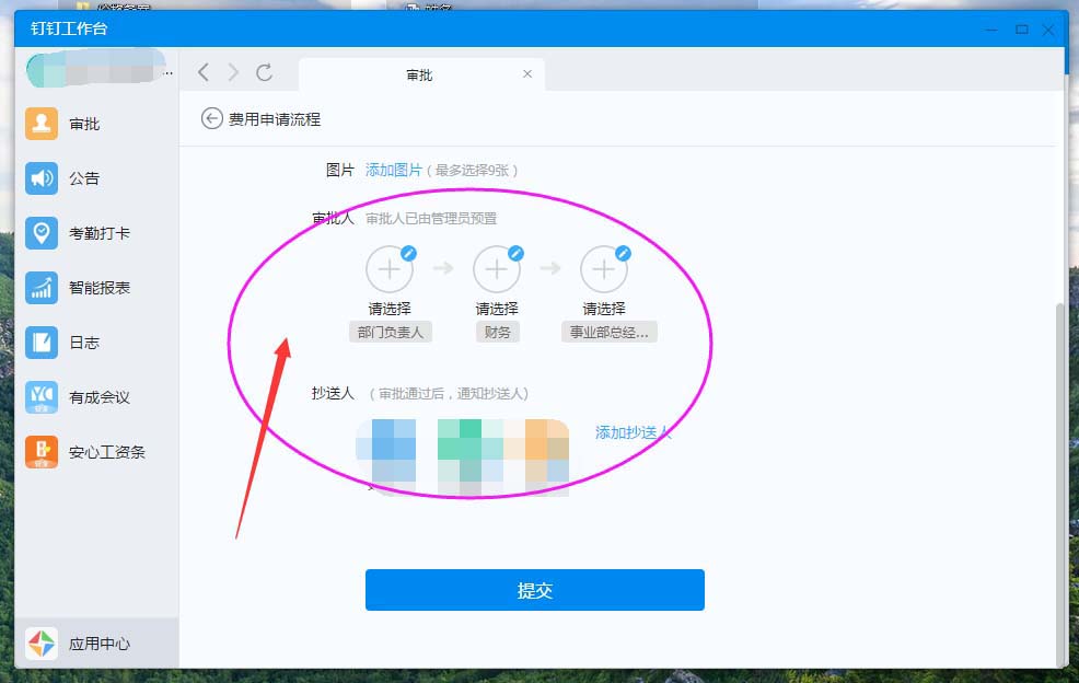 第六步:审批人&抄送人。"审批人&抄送人"即该申请需要审批和抄送的人员;如下图: