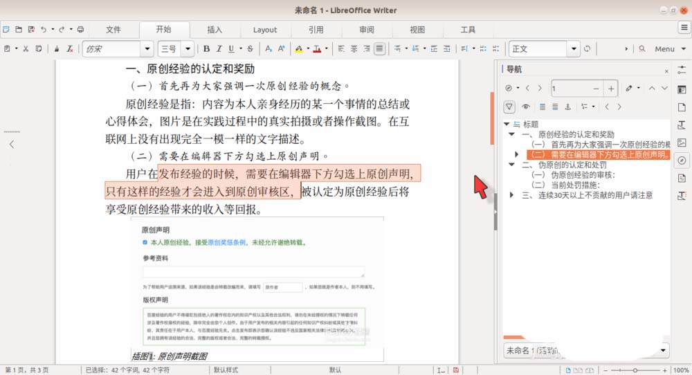 在 MS Office Word 中,如果打开了"文档结构图",那在文档中移动时,当前光标位于哪个段落,则文档结构图中的相应段落标题就会高亮,让用户时刻知道自己处于文档中的具体位置,这在浏览修改大文档时,特别有用,LibreOffice怎么开启内容导航呢?请看下文详细介绍。