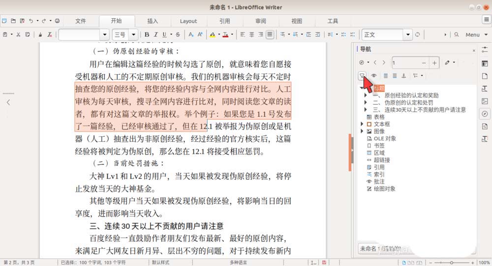 4、难道是 LibreOffice Writer 不如其他 MS Office Word 功能强大吗?当然不是。现在,我们单击导航侧边栏上方工具栏中的"内容导航"按钮(一个形似漏斗的图标)。