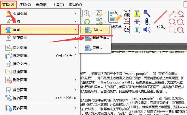 1、设置pdf背景的话,需要点击文档按钮,然后再选择其中的背景,最后点击背景中的添加按钮。