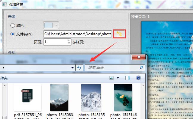 3、接着给大家介绍如何设置文件背景,我们只需要在来源中勾选文件名,然后再点击文件名后面的文件夹按钮。然后在弹出的本地文件夹中选择合适的文件。