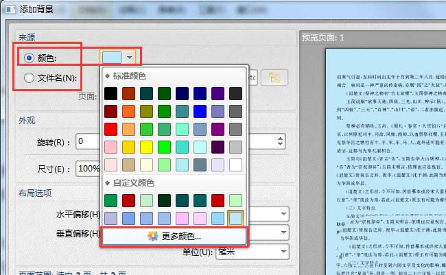 2、点击了添加按钮之后,会弹出添加背景设置框,在设置框里有两种背景设置选项,一种是颜色一种是文件,这里我们先选择设置颜色背景。点击颜色块,会弹出颜色板,在颜色板中我们可以选择合适的颜色作为背景色,如果颜色板中没有我们想要的颜色,可以通过点击更多颜色来自己调设颜色。
