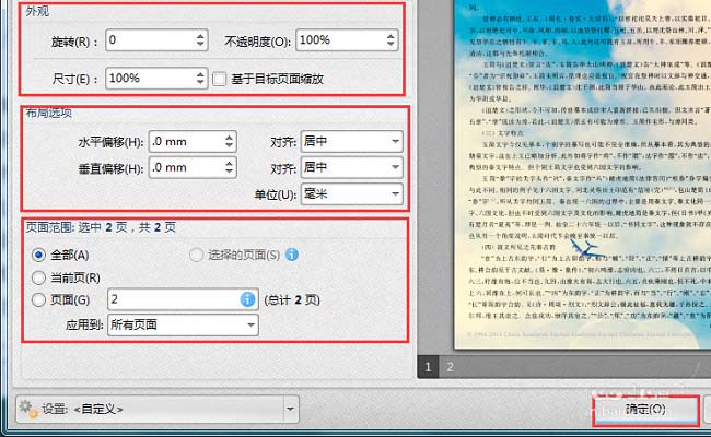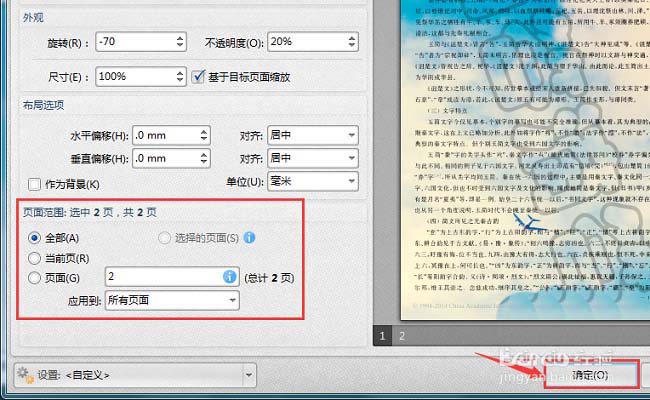 4、选择好作为背景的文件之后,我们在下方对背景的外观、布局选项与页面范围进行设置,设置好了之后点击确定按钮。