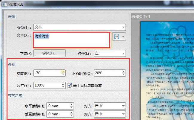 2、在弹出的添加水印菜单中,我们选择水印类型为文本,在文本框中输入水印内容。接着再在外观与布局选项中对水印的外观与布局进行设置。