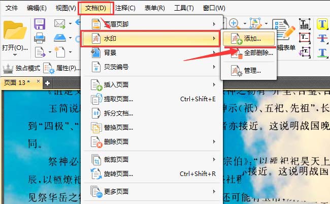1、这样pdf的背景就设置好了,接下来我们开始设置pdf水印。点击文档按钮,在文档中选择水印,再点击水印中的添加按钮。