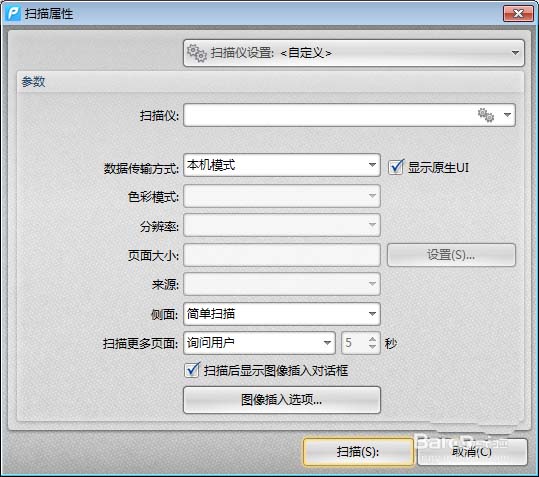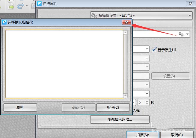 4、在扫描属性页面中我们可以选择扫描仪设置按钮,进入到扫描仪选择页面中。