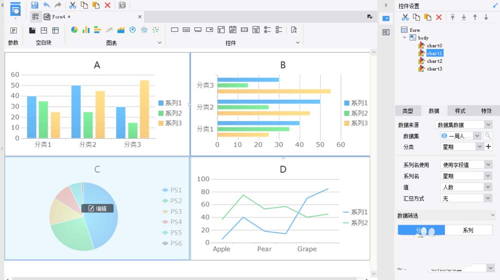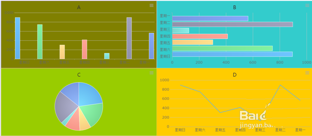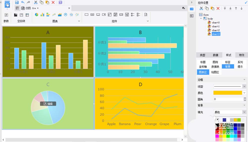6、返回到报表设计器,分别设置四图的背景颜色和边框颜色,调整柱状图和条状图的柱子的宽度,如下图所示: