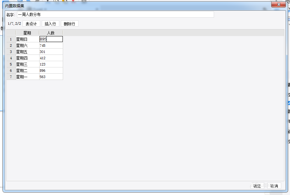 3、新建一个内置数据集,创建一个表,包含了星期和人数两个字段,并插入七条记录,如下图所示: