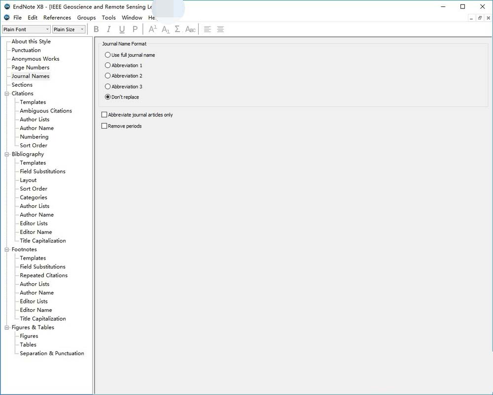 4、在左侧栏选择【Journal Names】,将原设置【Dont replace】改为【Abbreviation 1】。
