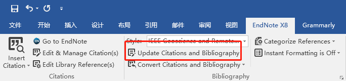 6、返回到Word中,在Endnote选项卡中选择【Update Citations and Bibliography】。