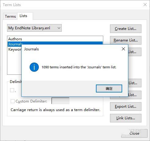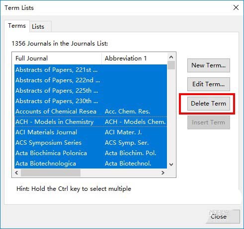 9、在【Term Lists】对话框中,全选所有的期刊名称,然后选择【Delete Term】