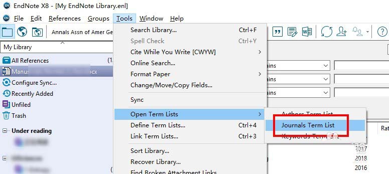 8、在Endnote软件中,打开【Tools】|【Open Term Lists】|【Journals Term List】