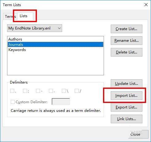 10、然后依然是在【Term Lists】对话框中,打开【Lists】选项卡,选择【Import List】。
