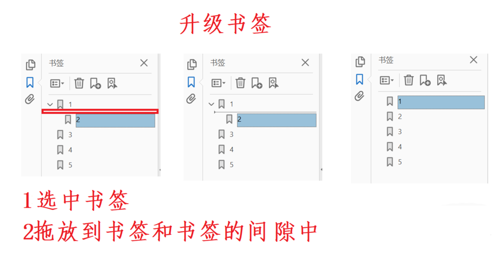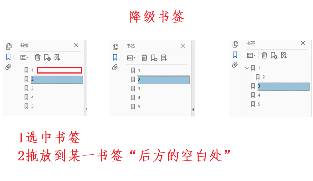 1、动画演示——降级书签。选中书签,拖放到某一书签"后方的空白处"。