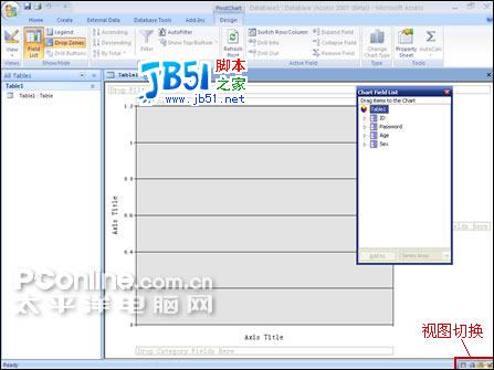 为了布局更合理,新版本的Access使用了类似Word的视图切换功能(如图七)。有数据透视图、数据透视表,图表设计三种视图待选。