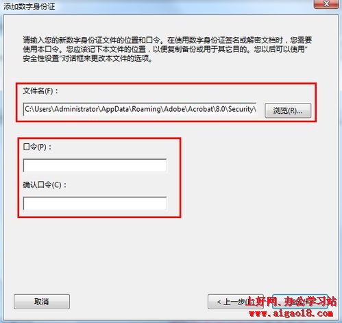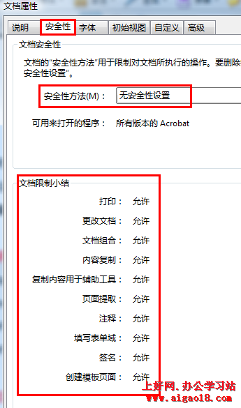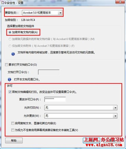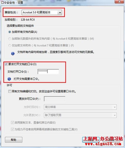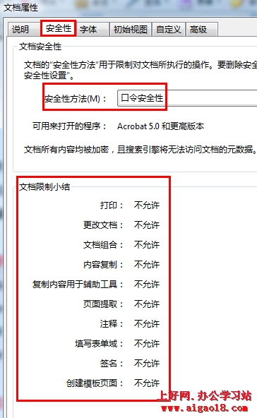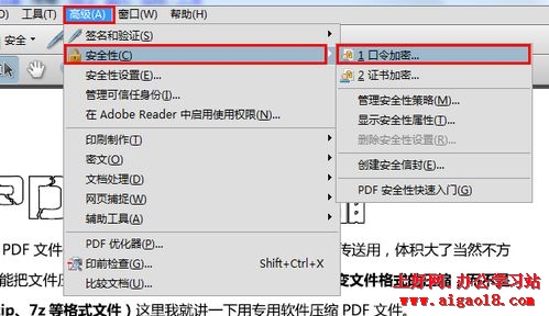 1. 口令加密包含"打开文档的口令"和"限制文档编辑打印口令",如果我们设置了打开文档的口令, 那么我们在打开这个文件的时候就需要输入密码才能够打开,这种密码只要设置的复杂一点 基本上就是破解不了的。 加密前我们可以看一下文件的属性,菜单栏,文件-------属性 安全性选项卡显示如上图 接下来我们加密, 菜单栏,高级--------安全性--------口令加密,弹出加密对话框,我们只要设置好 文档打开口令就,并且在"要求打开文档的口令" 前打勾,确定,弹出确认对话框,再次输入密码 , 然后保存一下就OK了~~~ (兼容性一项我们可以使用默认的设置) 保存以后关闭文件,再次打开会提示输入密码,那么我们的加密就成功了。 2. 限制文件编辑和打印的密码设置 菜单栏,高级--------安全性--------口令加密 , 弹出加密对话框,我们如图设置好"许可"那一栏中的 项目就可以了: 去掉"为视力不佳者启用屏幕阅读器设备的文本辅助工具"前勾的时候会弹出如下对话框,确定即可 数字证书加密的安全性要比口令加密高上很多,要想要数字证书对PDF文件进行加密,那么我先要 自己创建一个数字证书。 菜单栏,高级-------安全性设置, 弹出安全性设置对话框,我们新建证书的话选择添加身份证 数字身份证用于:选择"数字签名和数据加密"这样可以两用 我们在证书的存放路径下找到了我们新建的证书 接下来我们就要进行证书加密的操作: 菜单栏,高级-----安全性-------证书加密 弹出对话框,确定,下一步 关闭后再次打开文件的时候,就提示需要证书和密码,两者缺一不可 要不然他是没有办法看你的文件的,安全性是相当高的。