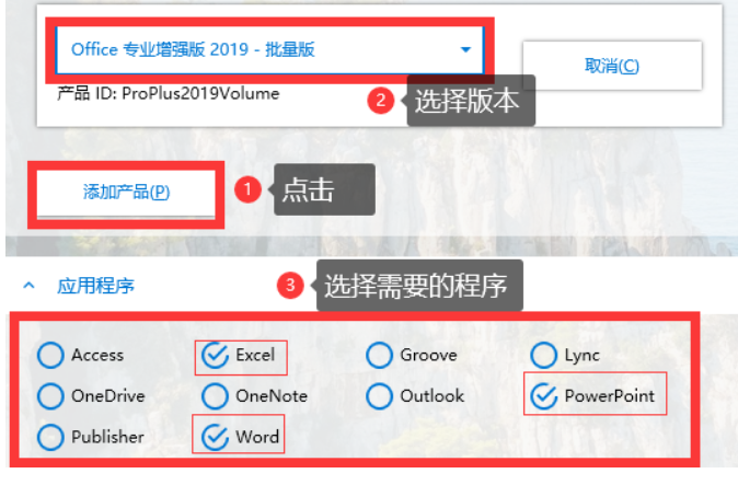 2.打开 Office Tool Plus,单击【部署】。点击【添加产品】,选择 Office 版本,请选择【批量版】,即产品 ID 后为【Volume】。