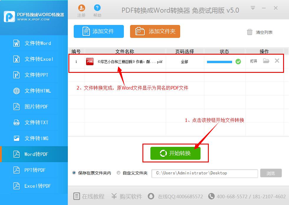 步骤6:点击"开始转换"按钮开始对软件中添加的:word文件进行转换,等待片刻转换完成,大家可以看到原来的word文件已经变成了PDF文件。